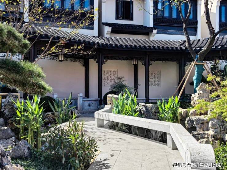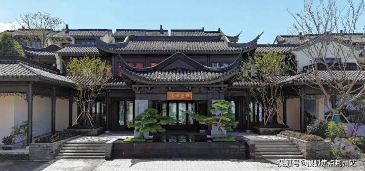 会所迎宾门庭处,车马院中式地铺境成气派之序,落客亭如展开的东方卷轴赫然入目。松石跌水组景以岁月臻石为骨、松风与水韵为魄,匠写中式山水意境。两侧紫薇苍劲枝干与粼粼波光,翘角飞檐相映成趣,演绎意境悠远的大宅气度。