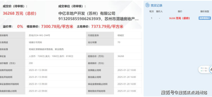 中亿丰&渭塘房地产开发渭塘44号地块,位于相城区渭塘镇盛泽荡路南、聚金路西,城镇住宅用地/城镇住宅用地(租赁),该地块在今年1月,由中亿丰&渭塘房地产开发底价竞得,成交总价36268万元,成交楼面价7301元/平,溢价率0%。