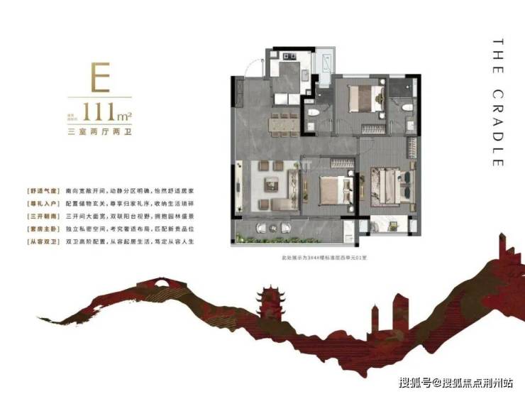 建面约111㎡户型以“舒居型”为设计理念,是无锡主城区稀缺的3房2厅2卫户型,南向6.8米大阳台将客厅、餐厅及厨房全都融为一体,开放性的布局、四开间朝南、“LDK一体化”设计+开放式厨房”,南北通透的格局保证了充足的采光。