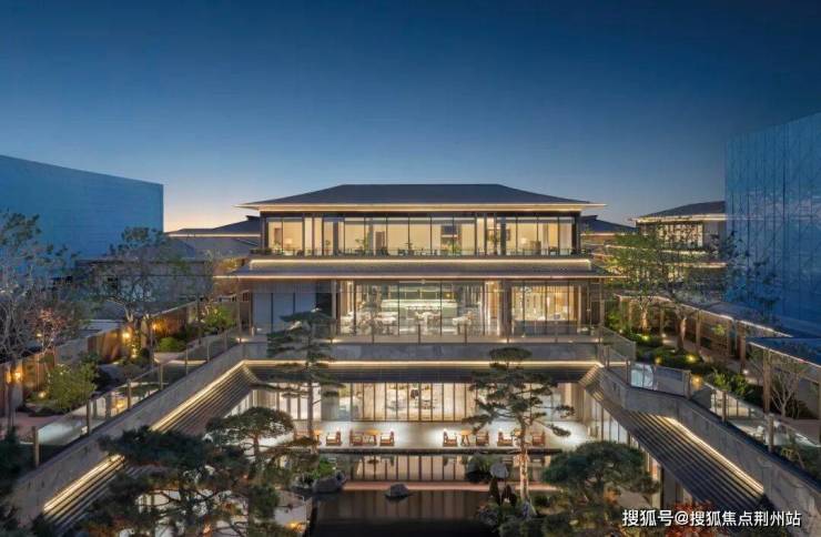 大面积石材、铝板、玻璃与金属格栅组合,提取东方屋檐的层叠符号,呈现出近乎“无边界镜面”的通透感。