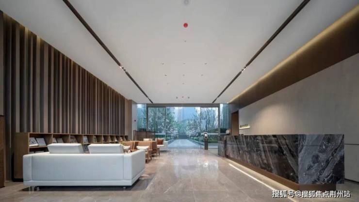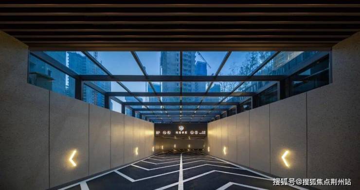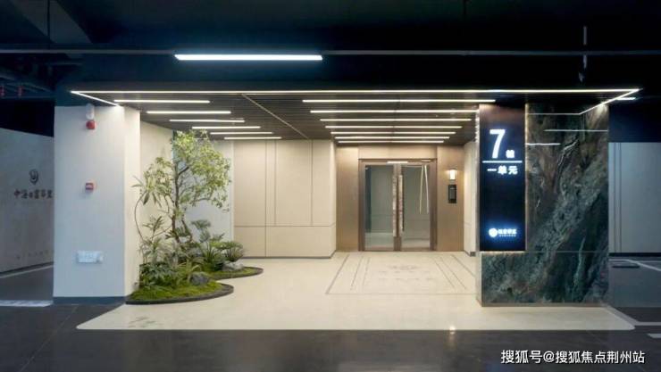 地下车库出入口,顶棚矩阵式灯光设计,整个精装车库有很温馨古典的迎宾气氛。顶上道道明亮灯光,有一种行驶在星光大道的仪式感。地下单元车马厅立柱由岩板砖装饰,顶面装有宽幅金属格栅吊顶,门厅绿植造景,智能人脸识别入户,人性化又富有极简美感。
