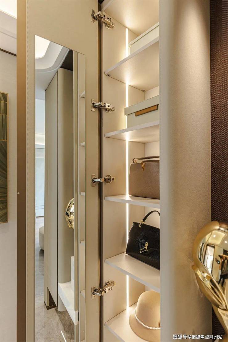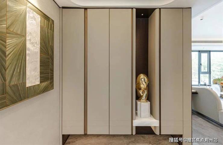 步入玄关空间,浅色系玄关柜映入眼帘,皮革材质的加持,让优雅的气韵更为浓烈。以简约弧度过渡的边角,曲线造型减弱了家具的棱角感,以一种低调而不失贵气的展现方式,吐露内敛而高贵的氛围表达。