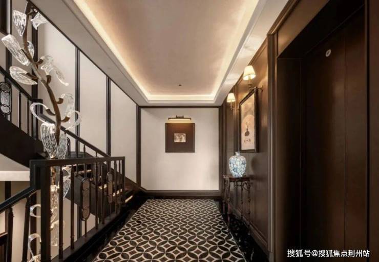 它还不止是宽,更有深度,走在这条缓坡而上的廊道上,是不一样的归家感受,两边列队欢迎的奢石,是「翠谷幽兰」,单方造价非常贵;顶上是三个玉石天井华盖,采用叠级的手法,有着宫廷的礼序。