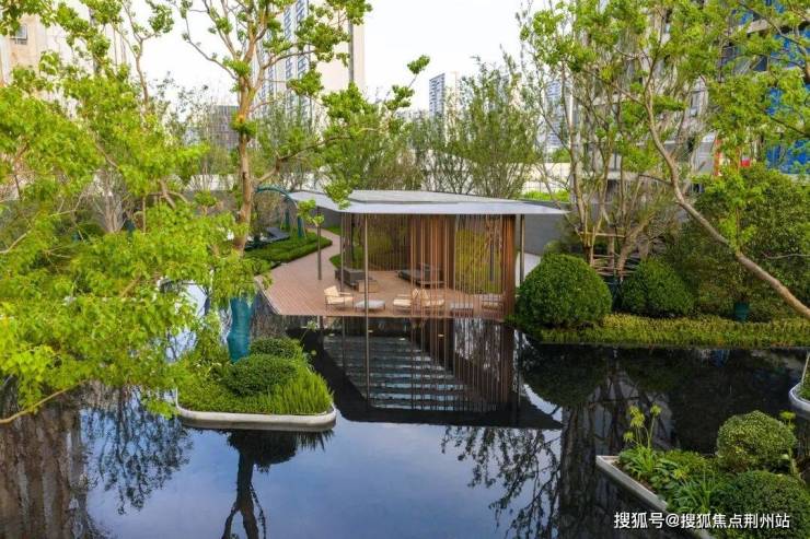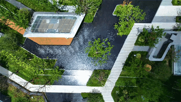 宽阔的迎宾场域拉开序幕,格栅、绿荫、水景、叠瀑、灯光彼此交织,不同高度的景墙与植被层叠而上,营造出恰到好处的轻盈感。