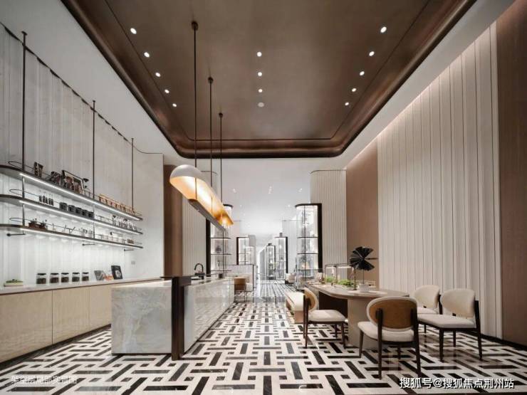 社区主入口横向展开面长达百米、高6米,参考酒店式入户设计,布置环岛落客区奢侈空间尺度。范思哲黑与安哥拉黑石材低调华贵,顶面千片鳞片造型似江浪灵动,百达翡翠原石与黄铜镶嵌而成“王冠之瞳”,整体空间奢华与优雅并存。