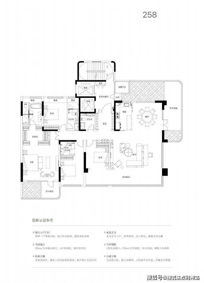 项目特色:南北双阳台为标配,每户实现50%绿植覆盖率,将原本属于低密别墅的院落空间引到空中,重新定义大平层生活方式。