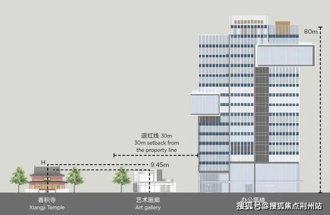 英蓝中心位于拥有3处世界文化遗产的中国城市:杭州,所处地块近邻京杭大运河(世界文化遗产之一),与运河畔的千年古寺—香积寺仅隔了一条24m宽的丽水路。一边是只有14.69m高的千年寺庙,而另一边则是规划高度80m的现代建筑群。若相邻而建,如此高度及体量的建筑群,势必给香积寺和整片区域带来不可逆的压迫感。