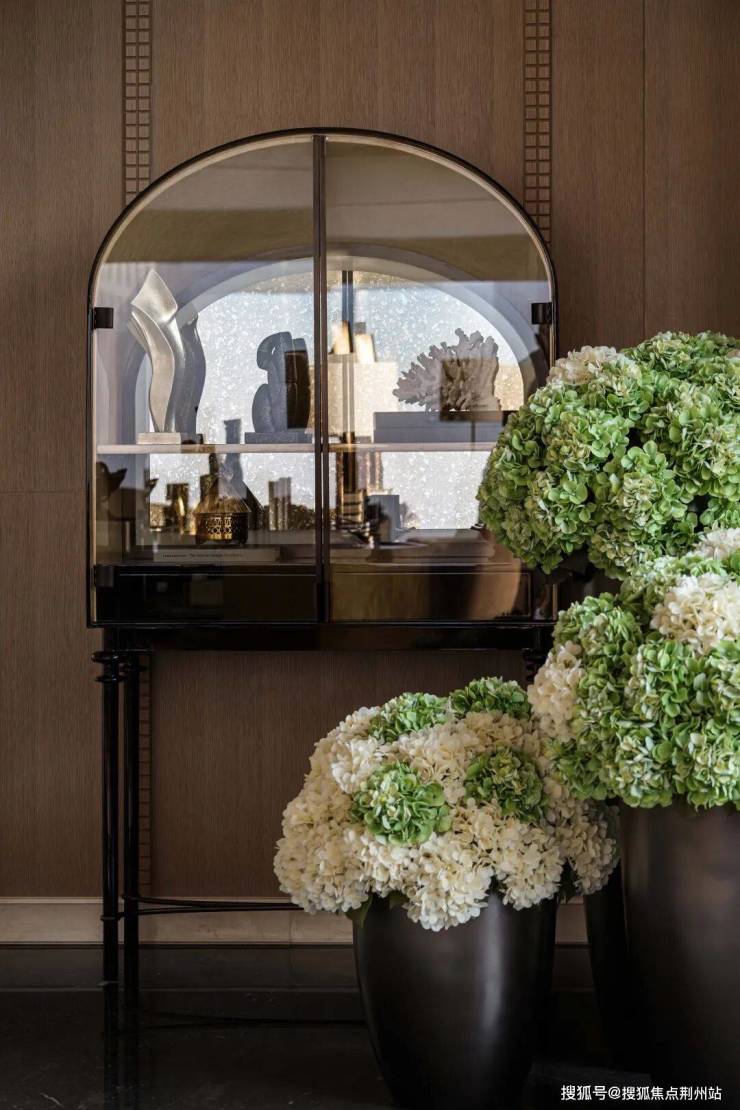 墨石地面镶嵌白色弧形徽纹,于摩登语境中凝练出法式几何的诗意秩序。弧形元素作为隐形的空间纽带,串联起通透流动的整体关系。