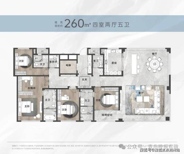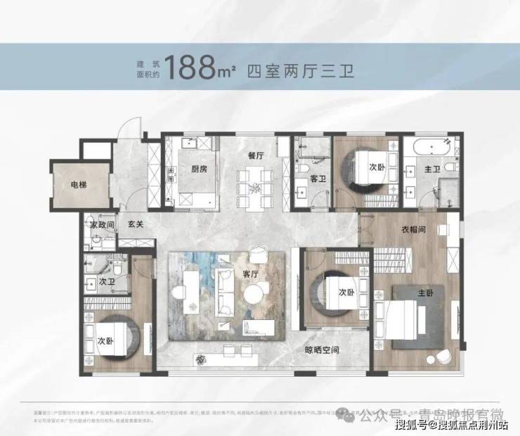 建面约188㎡户型的双套房设计,不仅满足多代同居的隐私需求,更通过约10米双开间阳台将海景资源最大化引入室内。