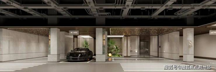 同时,8#地下大堂入口采取星空顶设计。从流光坡道、典雅车库再到单元地下大堂,业主车行归家的每一步充满仪式感,尊贵感扑面而来。