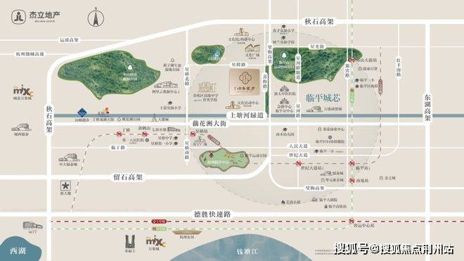 1、【三山一水,四面皆景】临平山、皋亭山、丁山、上塘河环绕,山水与建筑围合,形成藏风聚气的灵秀宝地,四面满目皆景。