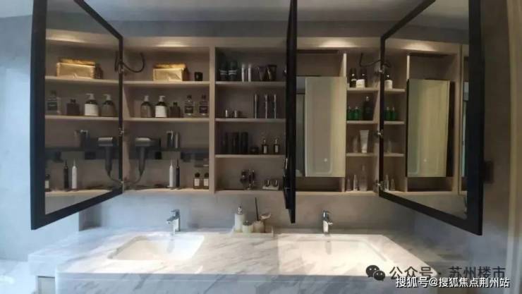 卫生间,设置壁龛、长镜面柜+收纳空间,可以摆放各类卫浴用品,防掉落杆、美妆冰箱全部安排到位。
