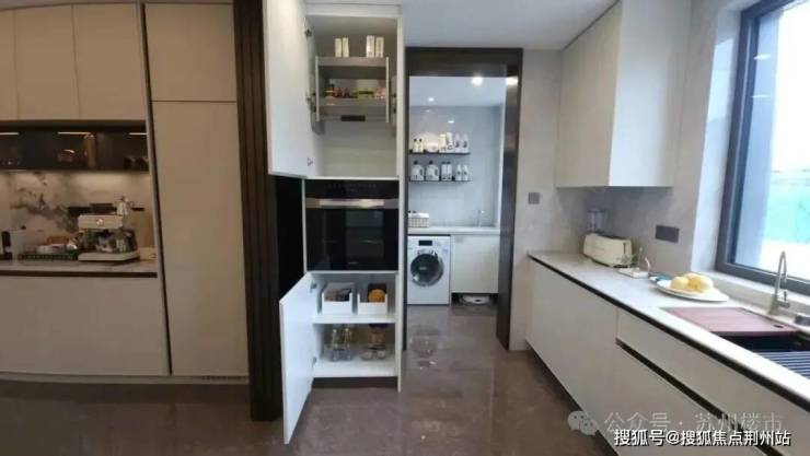 独立家政间干净整洁,能收纳清洁工具、清洗整理衣物,还能存放家庭杂物,连扫地机器人的位置都贴心安排好了。厨房更贴心,专门装了空调,还通铺了地暖,太懂女主人的心思了。