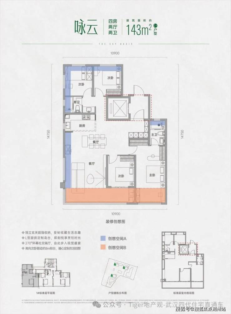 得房率提升至85~97%,百变空间(109m²可改大横厅2房,143m²可改大横厅3房);增加转角窗设计,拥有270°观景视野,采光效果更佳;主卧阳台优化,卫生间飘窗全优化,实际利用率更高;S 墙设计,冰箱嵌入更美观。