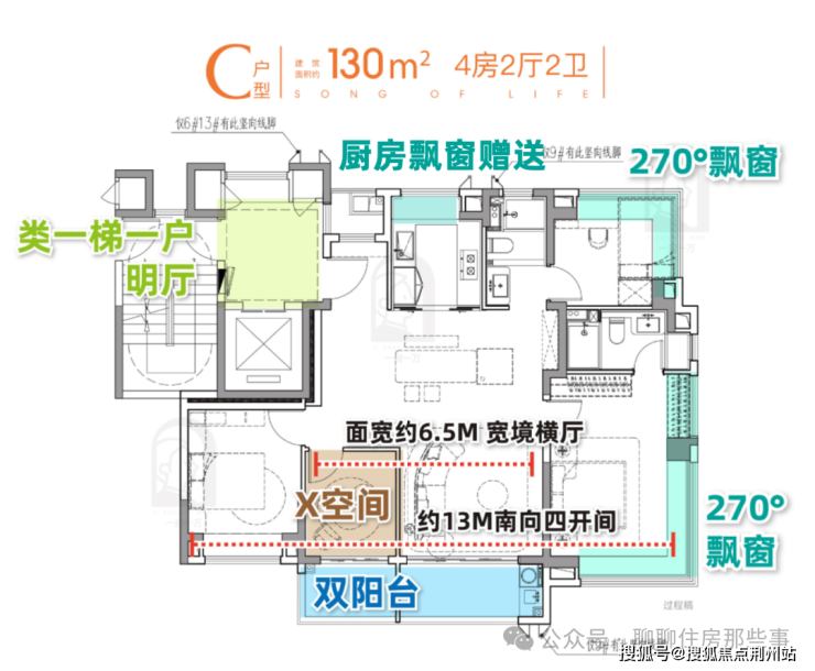 130㎡4 房 2 卫:四开间朝南 + 可变横厅,约 13 米南向面宽,预留 X 空间,三孩家庭或三代同堂一步到位。