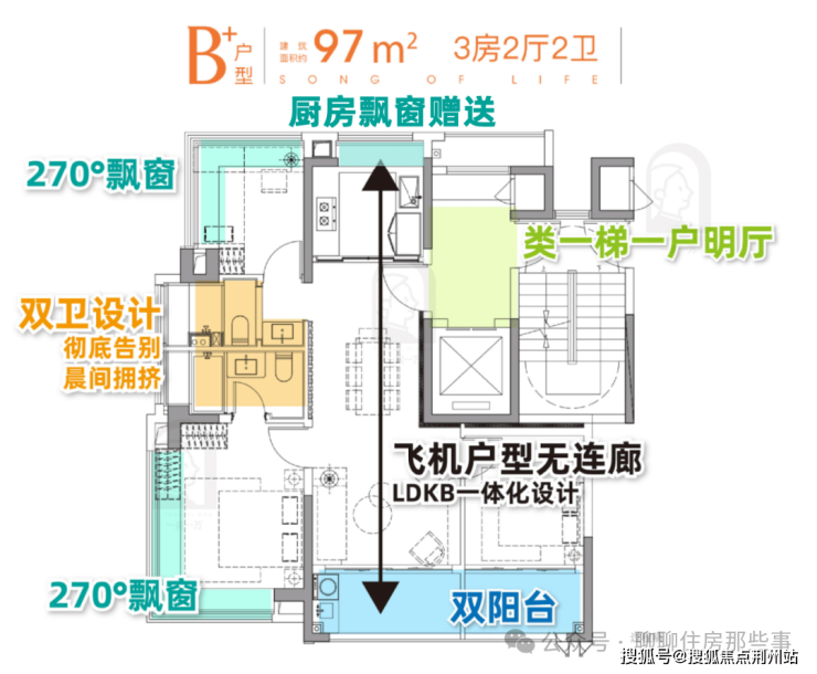 97㎡3 房 2 卫:双 270° 转角飘窗 + 全飘窗设计,双卫干湿分离,预算有限也能兼顾舒适度;