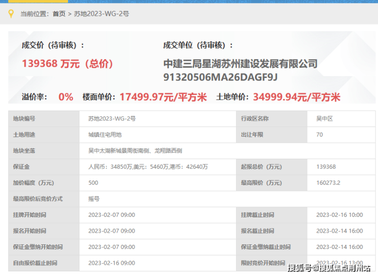 中建太泽之星|藏湖,即,苏地2023-WG-2号地块,位于吴中太湖新城景周街南侧、龙翔路西侧,是2023年2月16日,中建三局以底价139368万元竞得,成交楼面价17500元/平。