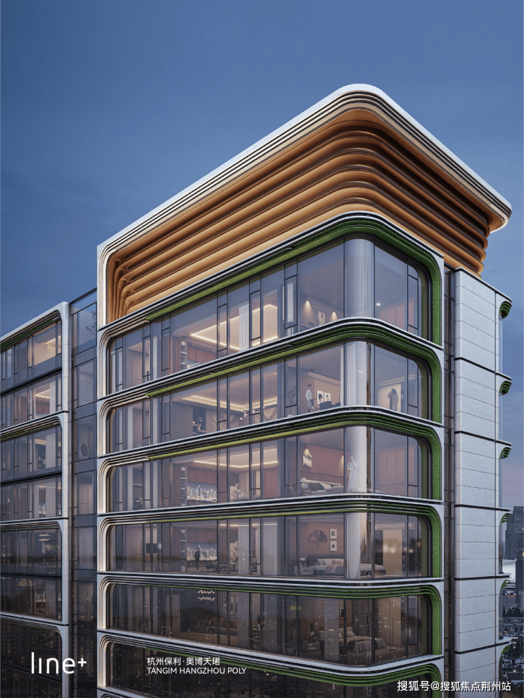 天珺的建筑立面由LINE+朱培栋大师独创的设计,获得了国家建筑美学专利。设计摒弃了早期对海外风格的简单复制,将龙井春芽、钱塘潮水、南宋官窑等元素融入建筑,最终塑造出独特的“钱塘春芽”立面——青绿色彩釉陶板如嫩芽般包裹建筑,细节处的冰裂纹理暗藏宋瓷韵味,为奥体打造了真正具有杭州辨识度的建筑符号。