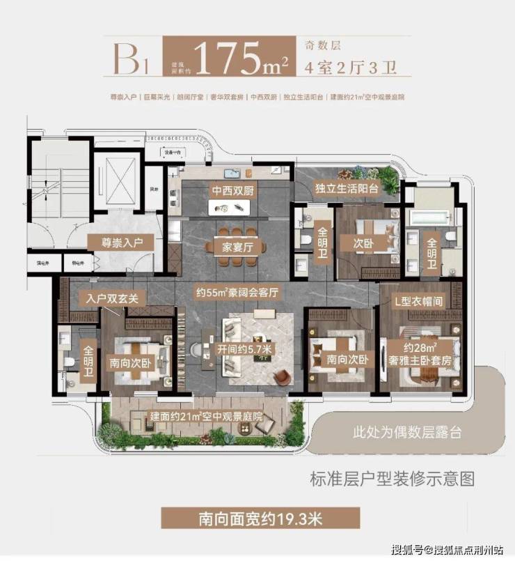 建面约175㎡户型,南向以一方空中庭院收纳四季风景与生活诗意,北向则匠心打造约4.5米开间独立生活阳台,将盥洗收纳、晾晒衣物等日常功能妥帖安放,为平凡日常赋予更多灵活多元的使用可能,让生活兼具诗意与烟火,从容兼得。