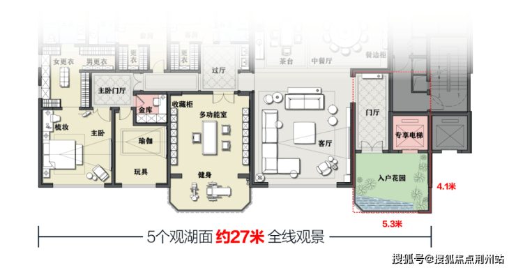 登上27楼,走进一套450平米户型,仿佛入画东湖。走出电梯,就是入户花园,花园外就是东湖。