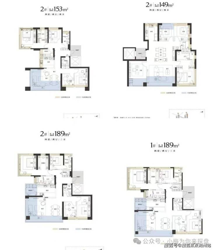 该项目一共三栋楼两个面积段,主力户型建面约146-189㎡,目前公示首开的面积为149㎡、153㎡和189㎡三个面积段四种户型。1号、2号楼东侧靠近和平大道为149平户型,西侧3-15层为153㎡;16层及以上为189㎡看江房源;3号楼为146㎡、153㎡和189㎡户型组合。户型图如下