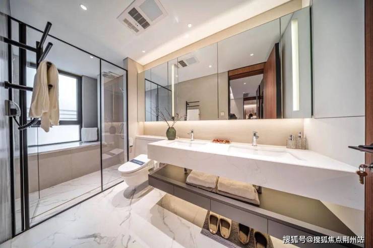 卫浴内,开发商对细节的把控也很到位,汉斯格雅的台盆、龙头、花洒,唯宝的坐便器,松下的浴霸,主卧智能坐便器、电热毛巾架,定制淋浴屏等非常贴心和人性化。