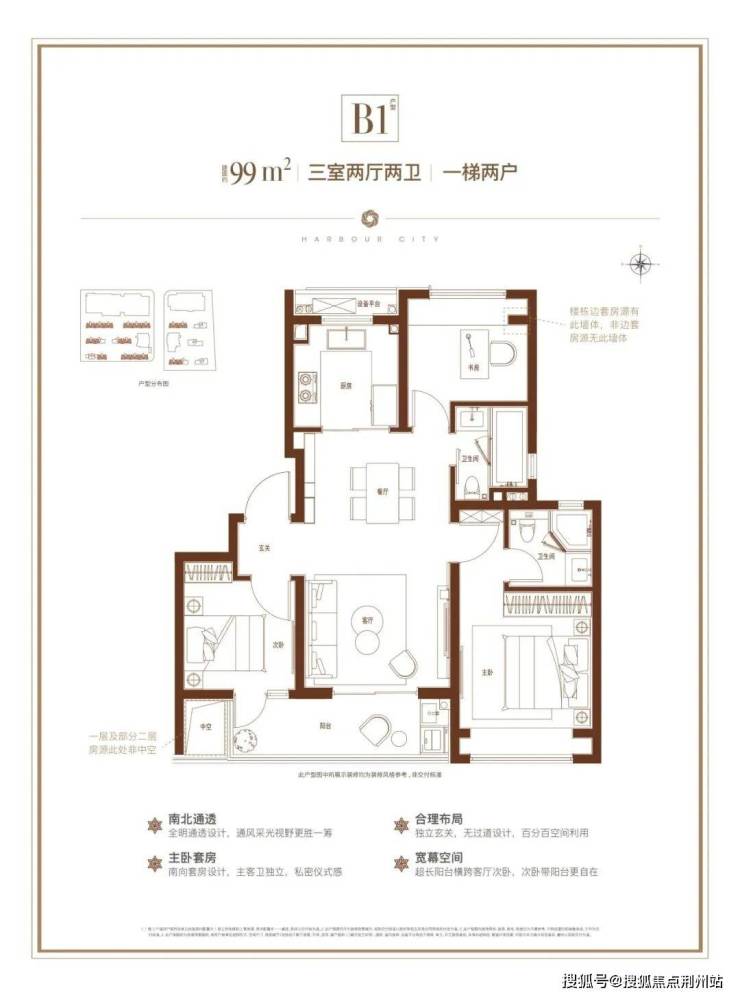 主力户型建面约99㎡3房2卫,总价段为约542万-669万(部分房源已售,以案场为准),它做到了: