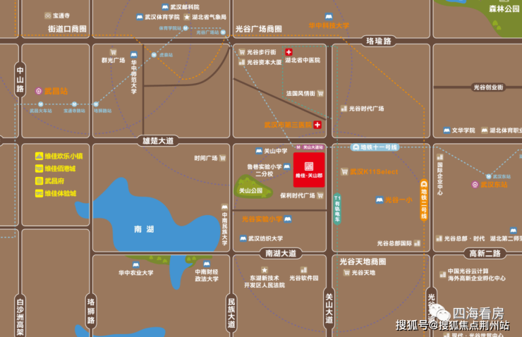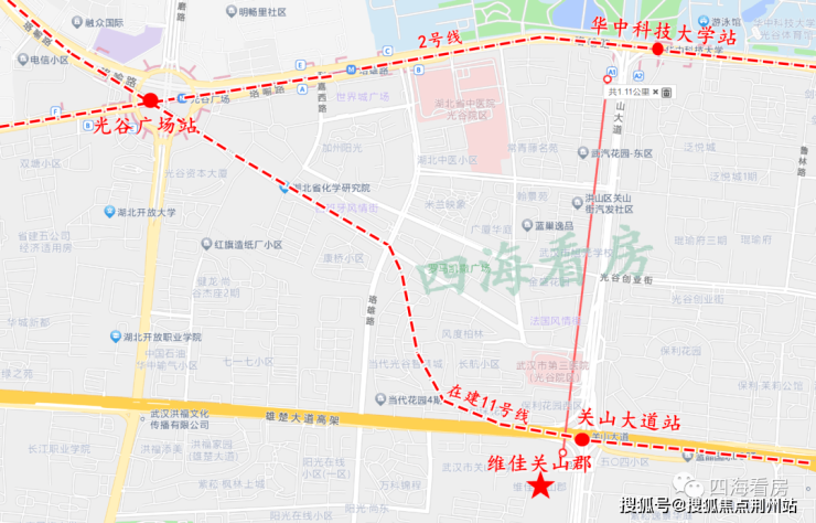 地铁与公交:在建的地铁11号线关山大道站就在小区正门口,小区距离2号线华中科技大学站约1.1公里,如果嫌远,可以乘坐11号线在光谷广场站与2号线换乘。