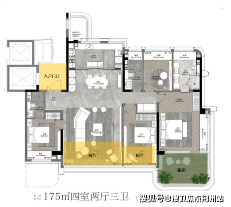 175㎡四房两厅三卫:独立电梯厅入户,私密尊贵,尊贵入户艺术玄关,独立生活阳台、家政空间l洄游式餐客厨(LDK)空间,豪华主卧,步入式衣帽间,主卫5件套配置,南向双套房,超大挑空平台。