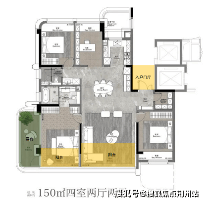 150㎡四房两厅两卫:独立电梯厅入户,私密尊贵 ,尊贵入户艺术玄关,设独立收纳库,餐客厨一体化设计,舒适主卧空间,主卫4件套配置,超大挑空平台