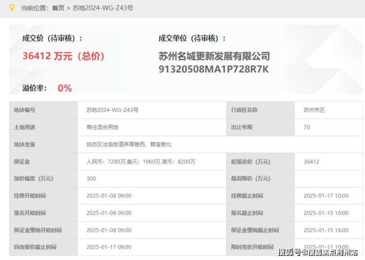 姑苏区43号地块项目,即, 苏地2024-WG-Z43号,位于姑苏区沧浪街道养育巷西、瓣莲巷北,是1月17日,苏州名城更新发展有限公司以底价36412万元竞得,成交楼面价28708元/平。