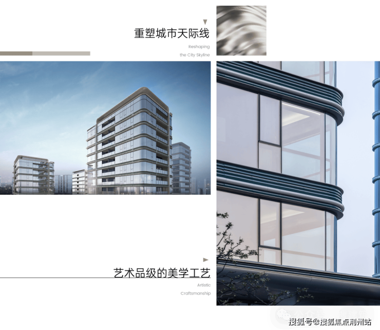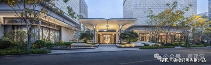 立面以香槟金金属线条勾勒轮廓,在光线下流淌出琥珀般温润光泽。这一暖色系的介入,既延续了“月华系”的现代基因,亦赋予建筑罕见的亲昵感。标志性的曲面屏设计通过取消转角结构柱,实现270°观景视野,达成视觉的无界延伸。大面积陶板材质的运用,以其比铝板更丰富的光影、比石材更灵动的质感,与香槟金线条共构出立面的温度与深度。