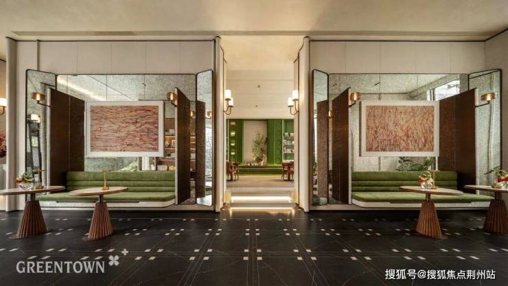 宽约60米、高约10.35米的大门,以「翡翠帷幔」为概念。顶部三段式发光云石吊顶,与下部四根芬迪白奢石立柱相互对应,呈现端庄稳定的古典美学气质。