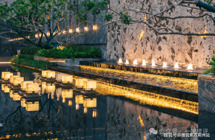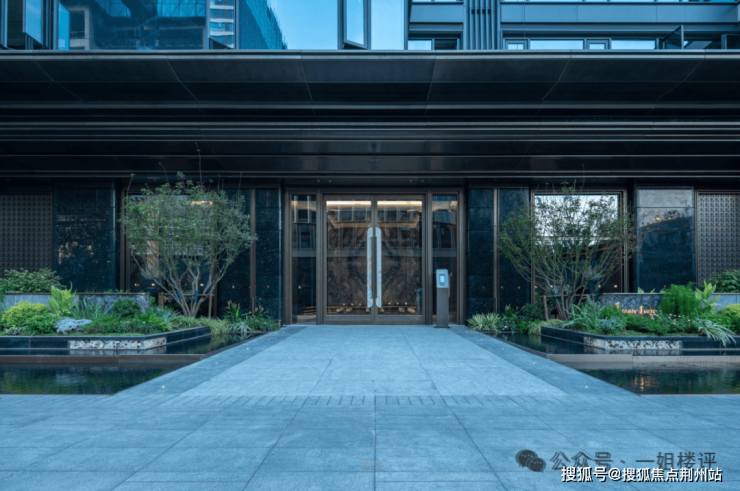 园林景观方面,项目内部有大量水景,层次感和设计感都很足。楼栋门口的景观也很讲究。1号楼门前有局部园林和水景: