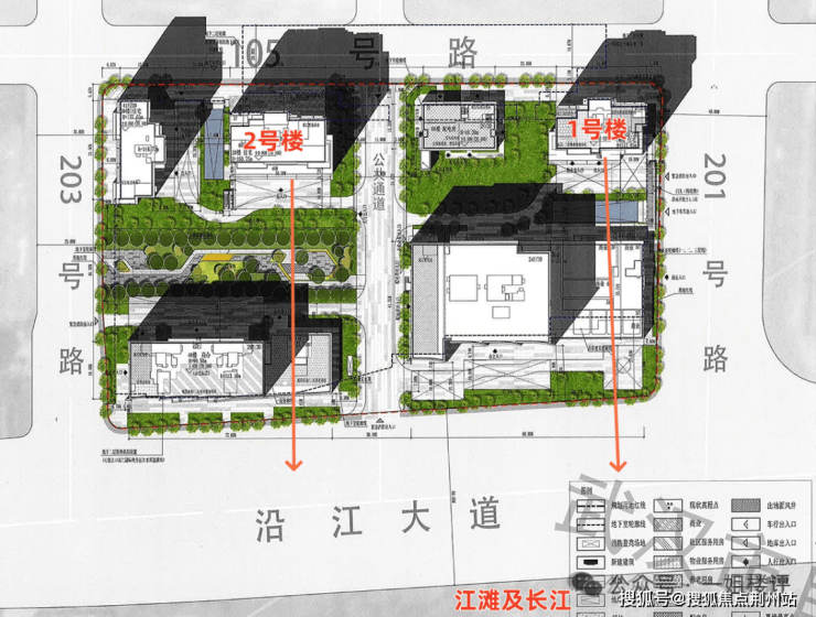 从平面图来看,1、2号楼均是西南朝向,且与前面的商办楼错开分布,可以直面长江。尤其是2号楼,正处地块中间位置,不仅高区有不错的看江视野,低区也有一定看江视野,是二七滨江真正的江景房。