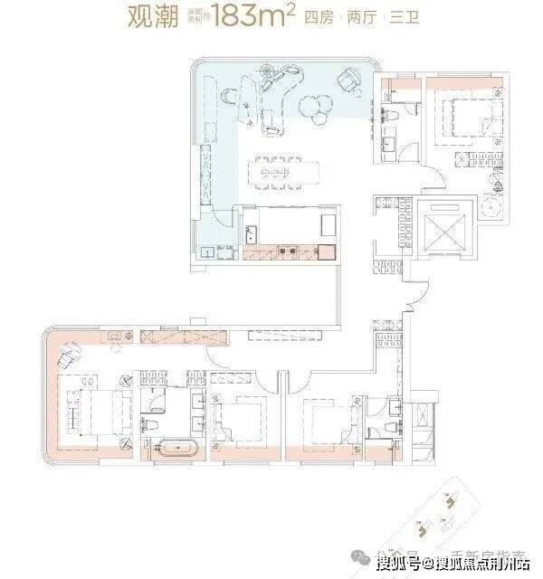 再看建面约183平大户型,除了总价较高,这个户型主卧虽然做了朝向的全景舱,但是看江视野有部分被客厅遮挡,不如建面约143平户型主卧看江效果好。