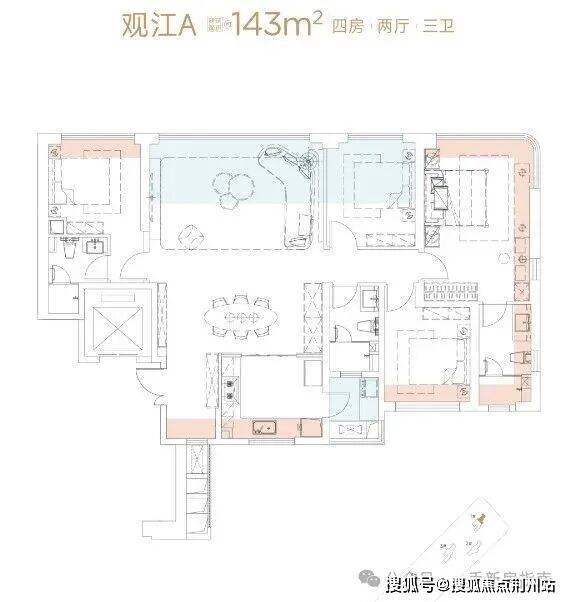 不过建面约143平户型卖的更好,抛开价格因素之外,做到了四开间朝西北,客厅、三个卧室可无遮挡看江,尤其是主卧还能做到270°观江效果。