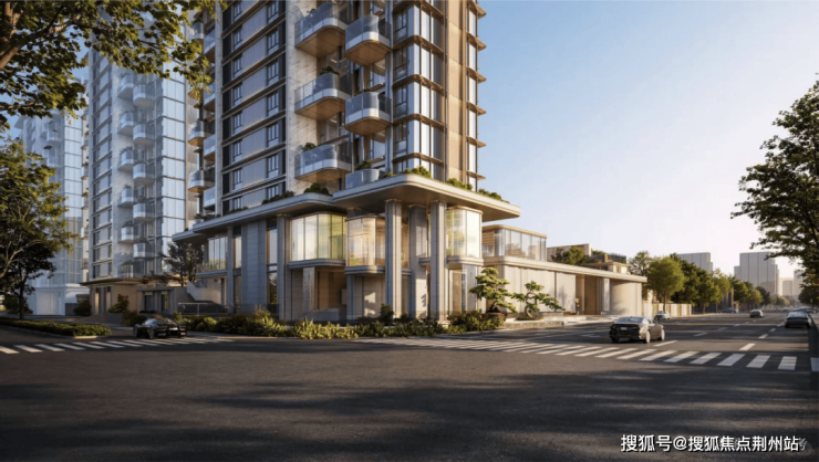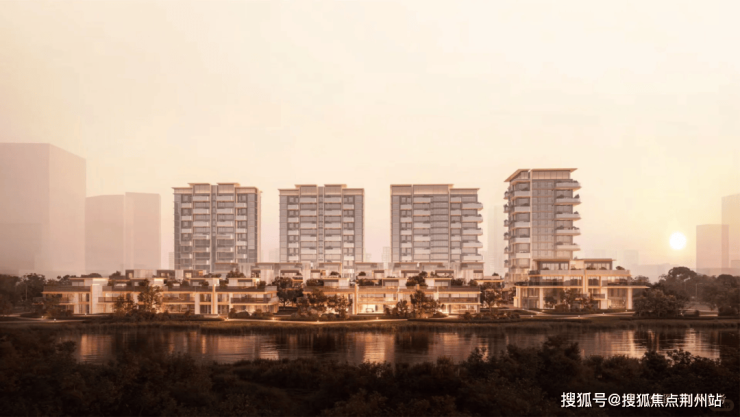 建筑立面选用香槟金铝板、高透光玻璃与石材为主材,整体色温精准调节至3000开尔文(K)——这个色温刻度介于绝对冷调与绝对暖调之间,不刺眼、不冷清,光线柔和内敛。顶端以“花冠生长”的舒展形态整层收束,主体立面融入“水波横叠”的横向韵律线条,整套设计语汇都撷取自明湖的自然意境。对居住者而言,归家途中远远望见的那一抹暖光,本身就是体验的一部分。