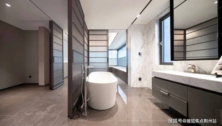 主卫不同于以往,采用了三分离的设计,另外还带有浴缸、双台盆,并且有完整的洄游动线,洗完澡后可以直接推开南面的移门。