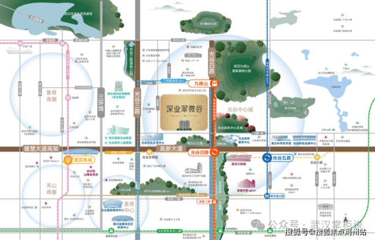项目位于佳园路与自主街的交汇处,属于关山核心板块,毗邻武汉东站,还是双地铁盘,周边配套除了教育资源一般,几乎无短板。