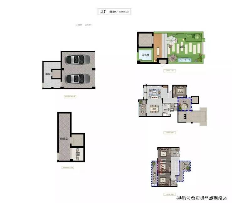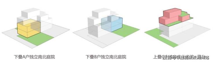 藏珑大境真的做到了叠墅向叠院的产品进阶。从示意图中能看到,上中下三叠,基本上保证了每个户型至少有3个南向开间,而上叠D户型,甚至做到一墅5开间朝南。