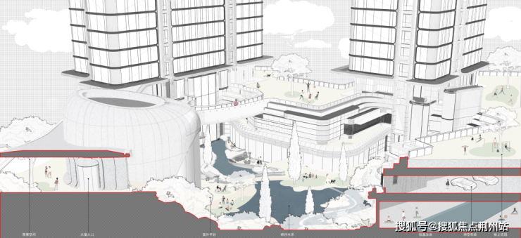 为最大化保障江景视野与居住均好性,gad 采用约6米整体抬高底盘设计。通过抬升建筑基底,整合地下车库、下沉峡谷与架空层,形成垂直方向约17.5米立体空间,打造城市之上的“空中岛屿”,实现地面和地下双重归家动线。