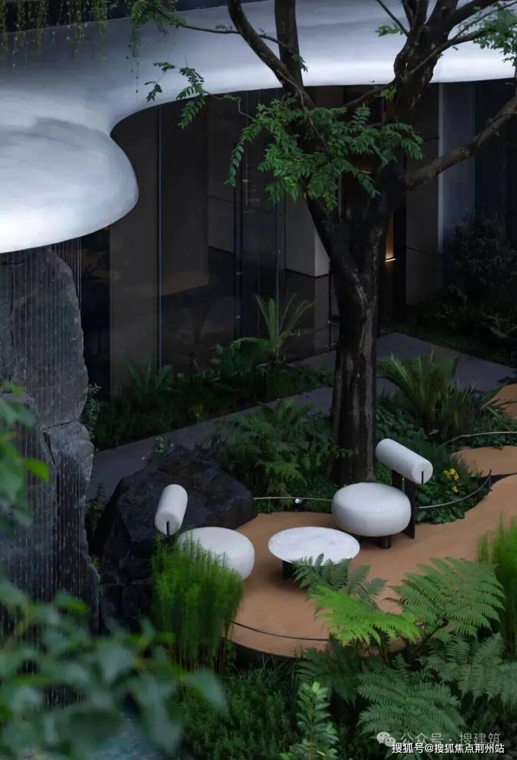 再往上,几朵从不同方向漂浮在空中的铝板祥云云朵,云朵轮廓打破庭院方正的边界,每片 “云” 的弧度、大小各异,让空间自下而上都呈现出自由流动的状态。叠瀑自云阶倾泻而下,云雾从景石群峰间升腾,婀娜大树探出枝头,洞天福地之间,梦幻如仙境。