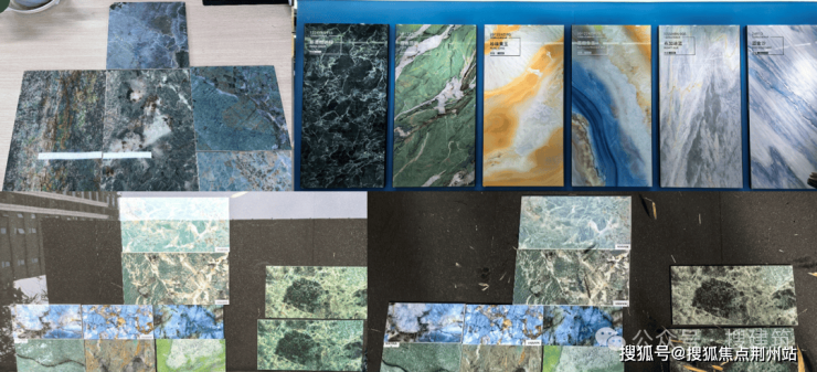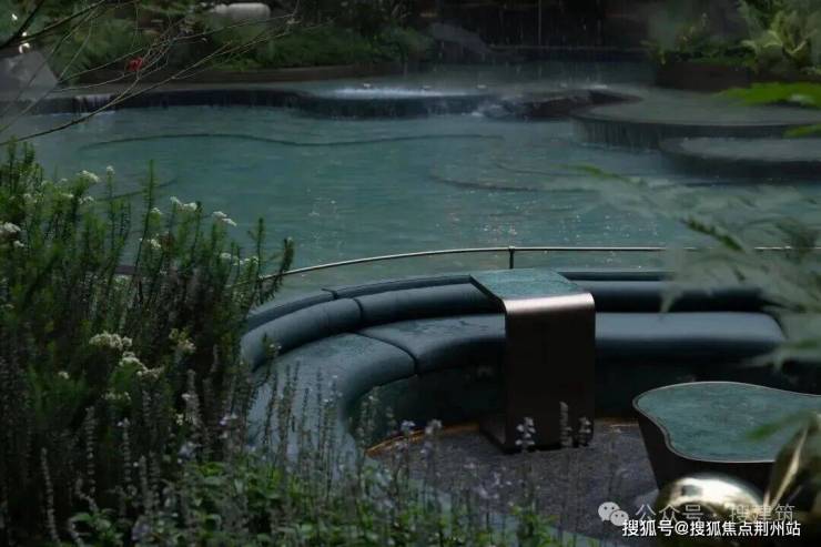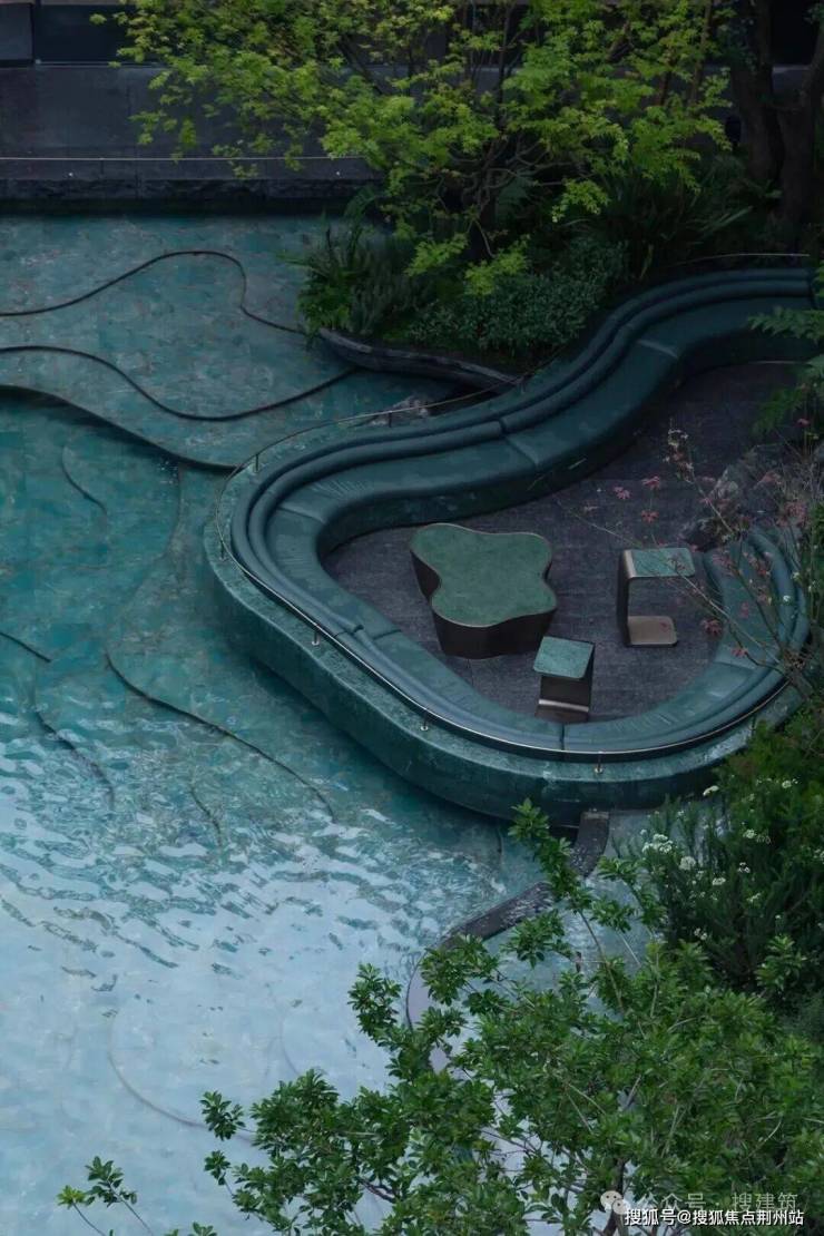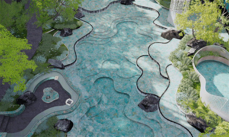底层水景自由扭动的弧线层叠错落,为了还原瑶池五彩池斑斓通透深邃的水色,在池底铺装的弧线设计和材料选择上都进行多轮推敲并实体打样。在数十种材料中最终选择亚马逊绿,其纹理或如碧波荡漾,或似翡翠交织,遇水呈现自然深邃的视觉效果,在光线折射下可呈现波光粼粼的动态美感。