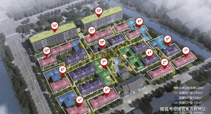共14幢105户,合院联排12幢57套,洋房产品2幢48套,其中联排总高3层有270平(26套),310平(17套),合院335平(6套),365平(3套),390平(4套)最后一排是两幢总高7层(一楼架空)的洋房共48套。