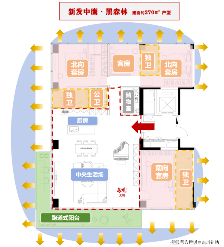 比如我跟你说,新发中鹰·黑森林建面270㎡的四房,是一个南向房间,三个北向房间,听完你大概率会一脸懵逼,因为我们之前见过的豪宅,这个面积段至少得四开间朝南吧。