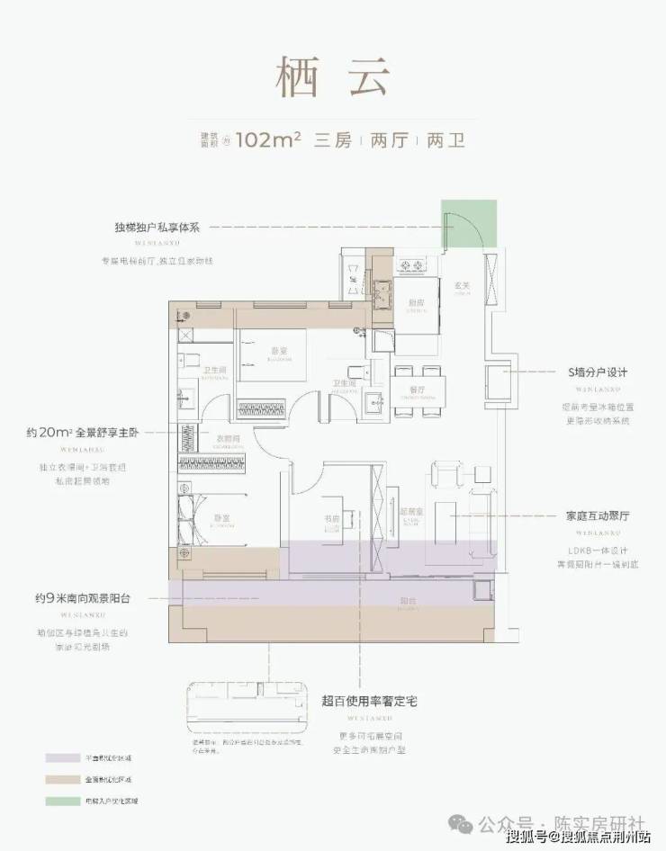 该户型位于1、2、5、6号楼的边户,独立电梯厅入户,约6.2 米横厅 + 跑道阳台:LDKB 一体化设计,客厅书房直接连通约 6.2米超大10平阳台。南北通透,带独立电梯前室,南北双阳台,除南北双阳台可优化外,阳台外面还有较大面积花池空间可优化;此外,该户型北向卧室和厨房还有飘窗优化空间。