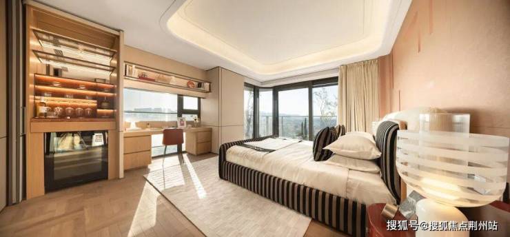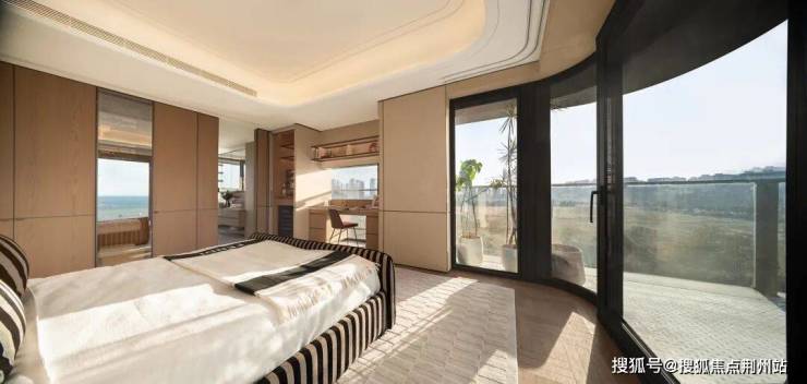 双露台带来的不仅是功能上的丰富,更重构了居者与湖景的关系。这一理念同样延伸至该户型的其他空间,比如——主卧套房通过转角玻璃幕墙设计实现三面采光,约17.8米南向面宽构成超奢观景平台。
