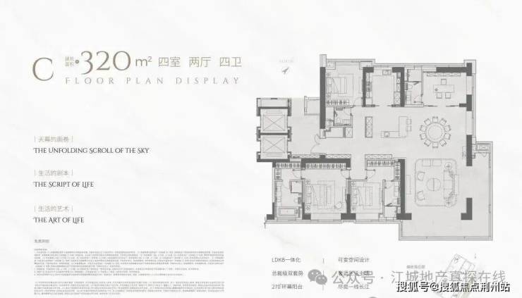 C户型建面约320平,四房两厅四卫: