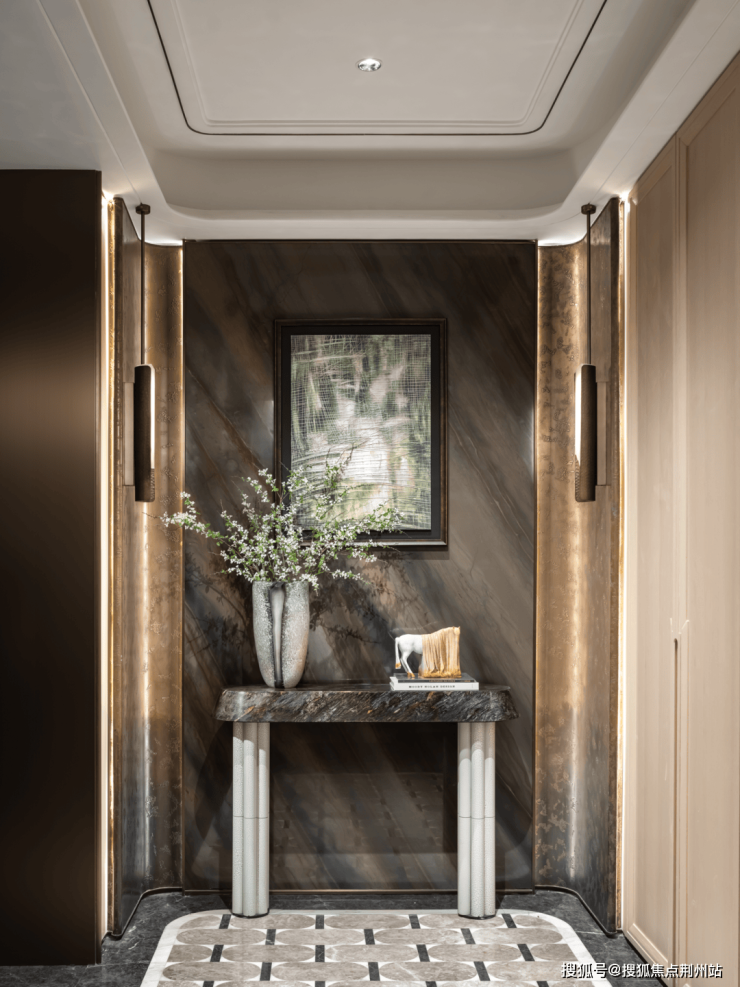 归家过程由入户玄关开启仪式感,作为住宅的第一场景及独立单元,点亮人们对于家的美好期待。一体化客厅体现大宅尺度,整体以沉稳深色系为主,搭配温和浅色调,丰富空间视觉层次感。公共与私密的空间流线一目了然,避免交叉重叠,既能保证开阔视野和互动空间,也能充分适应家庭成员各自休憩独处的诉求。